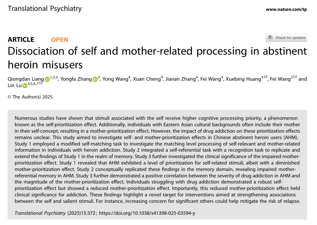 近日,清华大学心理与认知科学系王非课题组在精神病学领域权威期刊《Translational Psychiatry》(影响因子6.2,JCR Q1)发表了题为“Dissociation of self and mother-related processing in abstinent heroin misusers”的研究论文。该研究深入探讨了中国戒断期海洛因使用者的自我优势效应和母亲优势效应,揭示了药物成瘾对这些关键认知机制的影响。