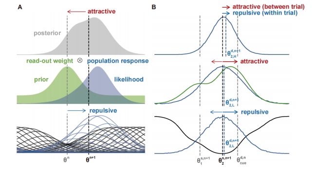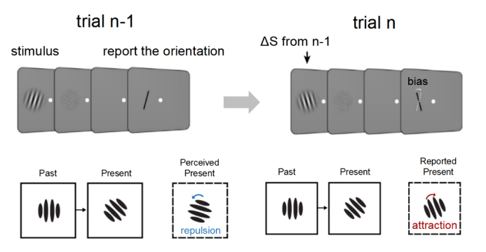 图1:序列依赖效应示意图。在 Adjustment task 实验范式中,被试需要报告当前试次的光栅方向。其报告结果会受到前一试次方向的影响,主要表现为两种模式:排斥效应与吸引效应。排斥效应指当前试次的感知方向会偏向远离前一试次方向;反之,吸引效应则指其报告方向会偏向靠近前一试次方向。