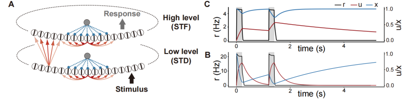 图2:具有两种短时可塑性(STP)的双层连续吸引子网络(CANN)。(A) 网络模型示意图。该层级化的双层结构分别模拟了视觉皮层中以突触短时抑制(STD)为主的加工过程,以及高级后感知皮层中以突触短时促进(STF)为主的加工过程。每一层内的兴奋性神经元按照其偏好方向 θ 排列成一维环状结构,并受到全局抑制(灰色实心圆)。层内与层间的神经元通过颜色渐变的连线连接,以表示突触连接强度。(B) STD 主导的网络表现出一种在低水平上维持的适应性突触效能。在刺激期间(阴影区域),神经活动(r)会提高神经递质释放概率(u),同时消耗可用的神经递质浓度(x)。刺激结束后,u 和 x 会恢复到基线水平。(C) STF 主导的网络则在较长时间内保持较高的突触效能(即较大的 u 值)。