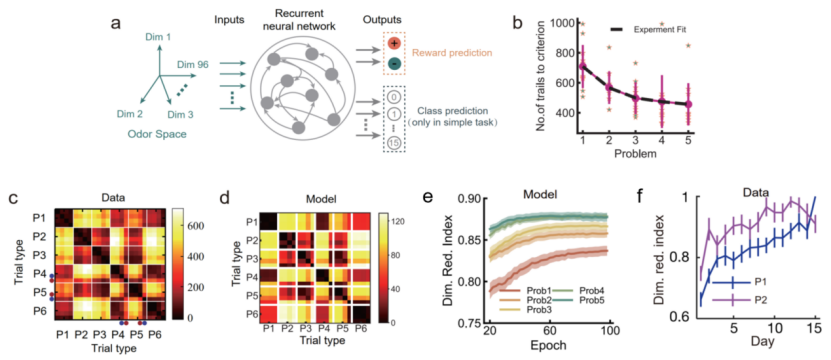 图 2(a)模型结构示意图;(b) 模型在图式任务学习阶段展现“学会学习”行为;(c-d) 模型形成类似老鼠OFC的结构化的任务几何表征;(e-f) 模型展现类似老鼠OFC的维度压缩现象。