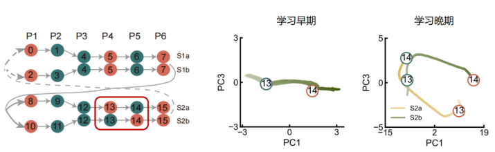 图 4 无塑造网络在学习早期就陷入过于低秩的表征空间,体现为关键的吸引子序列S2a/S2b的P4-P5共享一条吸引子轨迹。