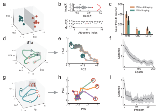 模型动力学可视化揭示了图式形成的连续演化过程,与提出的猜想一致。(1)离散吸引子的出现(图3a-c);(2)吸引子之间的连接,形成序列轨迹(图3d-f);(3)不同序列吸引子的压缩合并,形成共享轨迹(图3g-i)。最终,不同问题的相似结构在吸引子空间中被“叠合和抽象”为一条共享轨迹,即图式。