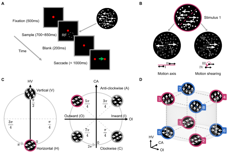 研究团队基于运动诱发错觉轮廓的现象,设计了一个典型的“线性不可分”视觉分类任务。刺激由一圈相向或背向运动的随机点构成,形成了在物理世界中不存在、但观察者能清楚知觉的一条倾斜的“虚边界”(Illusory Contour)。通过控制点的运动轴是水平还是垂直(HV)、运动方向是向外还是向内(OI)、空间排布呈顺时针还是逆时针(CA)三种特征,研究团队构建了一个三维刺激空间。在此空间中,不同倾斜方向的虚边界高度交错,构成经典的线性不可分问题(本研究将其称为立方体异或问题)。
