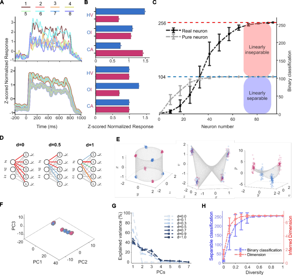 图3. NMS神经元的必要性与异质性的网络连接结构。(A-C) 真实神经元与合成的单一选择性神经元在计算性能上的比较。(D) 不同的人工神经网络。其神经元都具有NMS选择性,但异质性不同。 (E-F) 最大异质性的网络实现了七维表征空间,完全同质的网络只具有一维表征空间。(G-H) 随着异质性的增大,网络表征空间的维度变高,可实现的线性分类数增大,直至最大。
