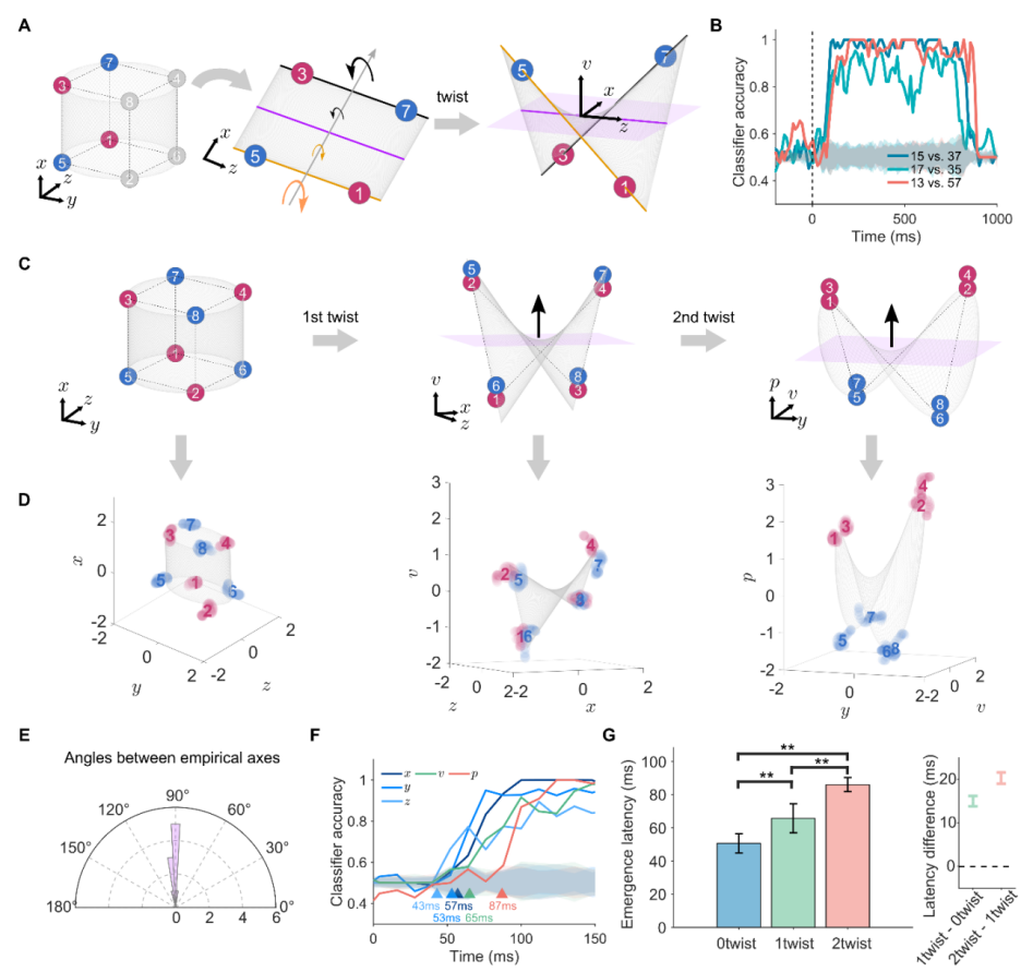 图2. 神经群体活动中的 “扭转”操作并升维神经空间的时间演化过程。(A-B)二维平面异或问题可通过扭转操作解决并真实存在于神经空间。(C-D) 理论推断立方体异或问题通过两次扭转操作可以解决,从神经表征空间中发现了该过程真实存在。(E) 扩展后得到表征空间轴两两正交,证实了七维表征空间。(F-G) 在时间上存在扭转操作的动态过程。