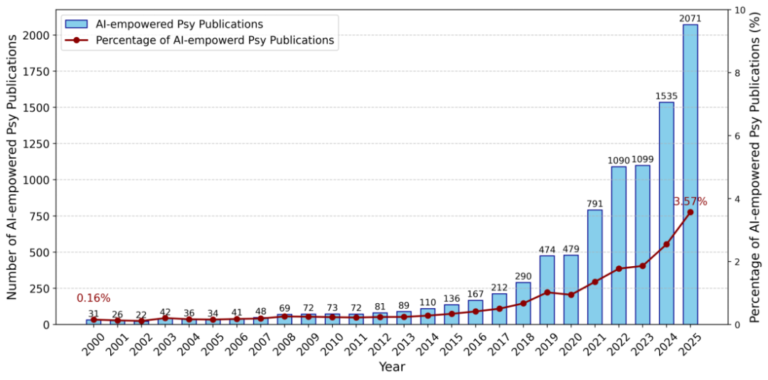 图1:AI赋能心理学出版物的数量与占比变化情况