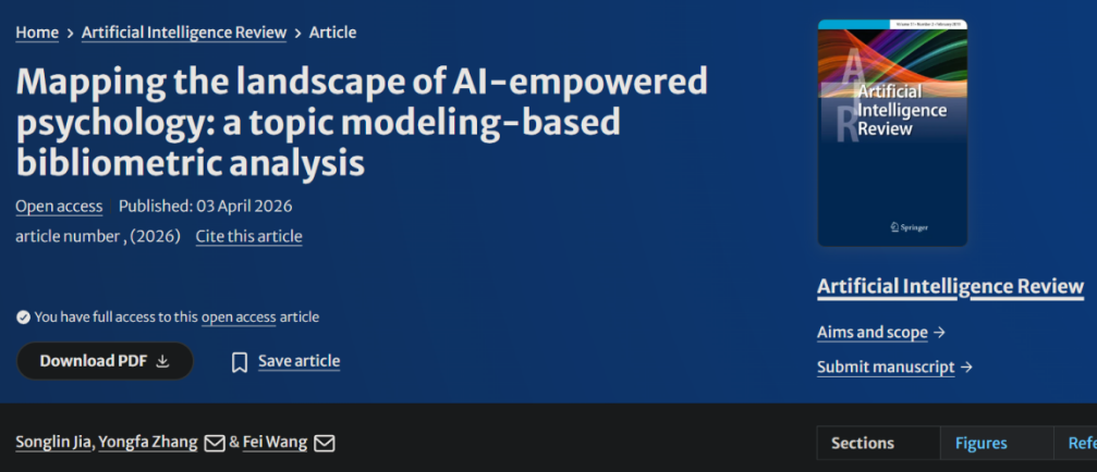 近日,心理与认知科学系王非课题组在国际学术期刊《人工智能评论》(Artificial Intelligence Review)(5年影响因子14.9,JCR Q1)在线发表题为“绘制人工智能赋能心理学的研究版图:一项基于主题建模的文献计量分析”(Mapping the landscape of AI-empowered psychology: a topic modeling-based bibliometric analysis)的研究论文。该研究系统梳理了“AI赋能心理学”领域的发展图谱,描绘了其主题结构、演变轨迹与出版合作格局。