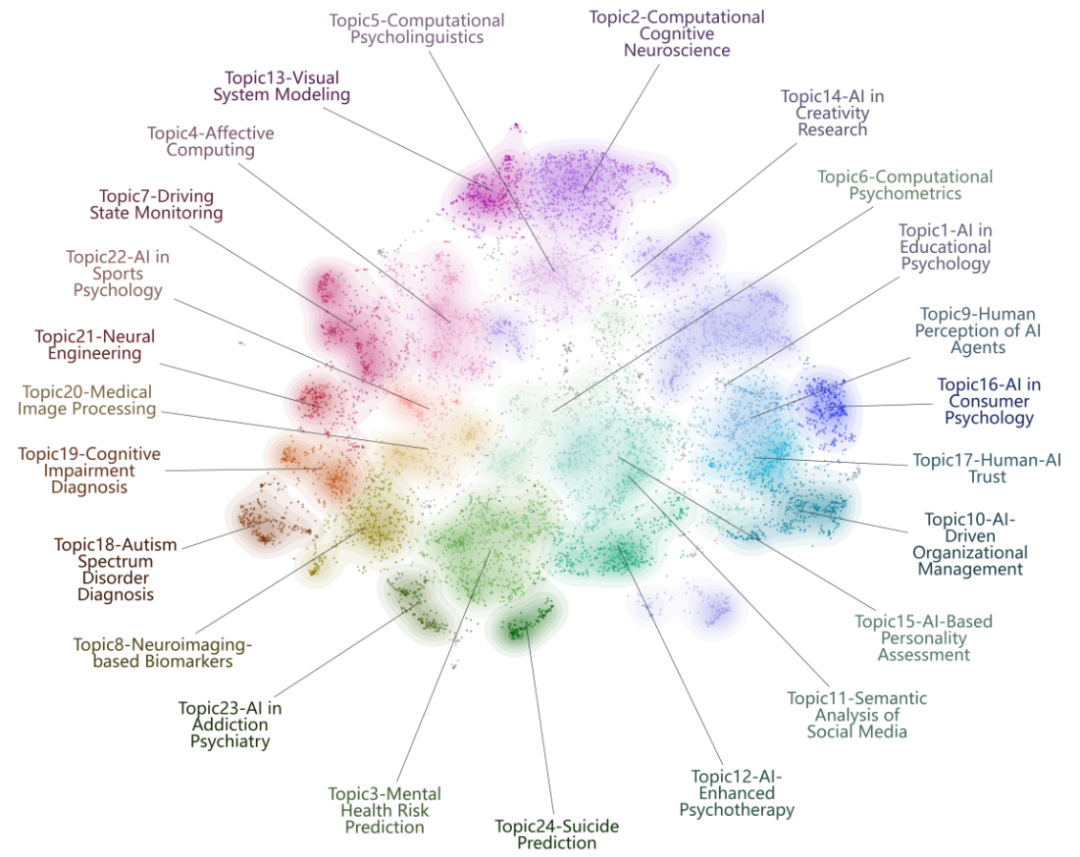 研究团队基于文献的标题和摘要,首先利用预训练语言模型提取文本语义信息,再通过 UMAP 降维和 HDBSCAN 聚类识别细粒度主题,并结合 c-TF-IDF 提取各主题的代表词进行命名。在此基础上,研究共识别出24个研究主题,并使用二维嵌入空间可视化展示了主题之间的语义邻近关系:空间位置越接近,表示相关文献在主题内容上越相似(图2)。该图直观呈现了从基础认知科学、临床心理到数字心理健康、人机交互等方向的相互联系,也反映出AI赋能心理学已形成既多样又彼此连接的研究版图。
