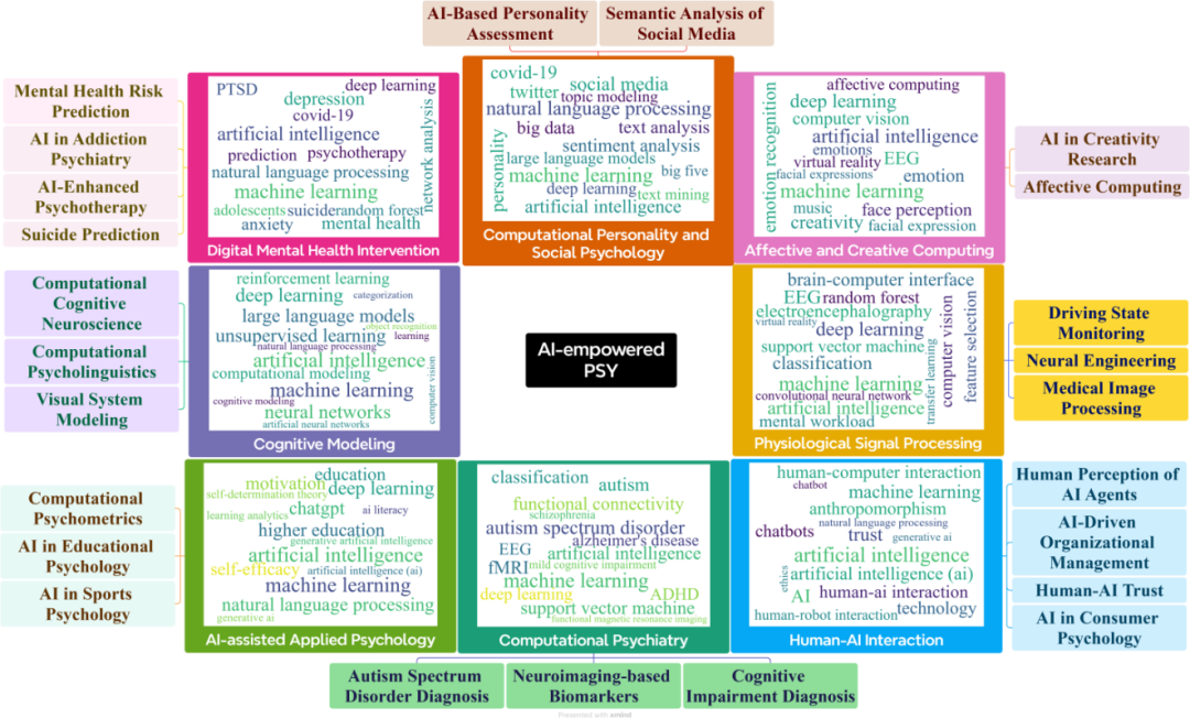 研究进一步采用层次聚类方法,在24个细粒度主题的基础上归纳出八个核心领域,分别为:人机交互、认知建模、AI辅助应用心理学、生理信号处理、计算人格与社会心理学、计算精神病学、数字心理健康干预,以及情感与创造性计算。图3中以代表性关键词展示了各核心领域的研究内容。例如,认知建模聚焦神经网络、无监督学习和大型语言模型等方法在认知机制研究中的应用;人机交互主要围绕信任、拟人化与伦理等议题展开;数字心理健康干预则集中于抑郁、风险预测和AI增强心理治疗等方向。