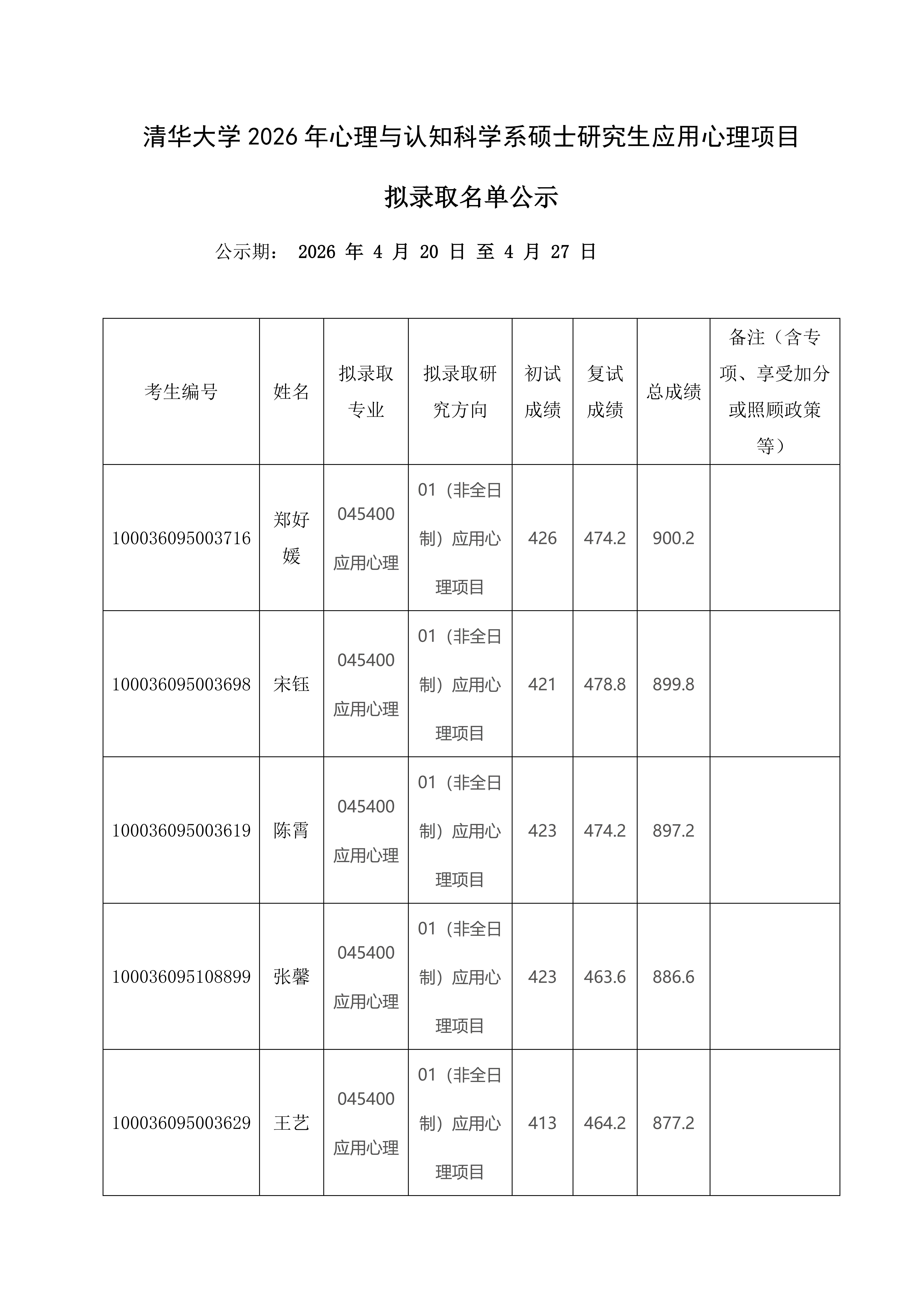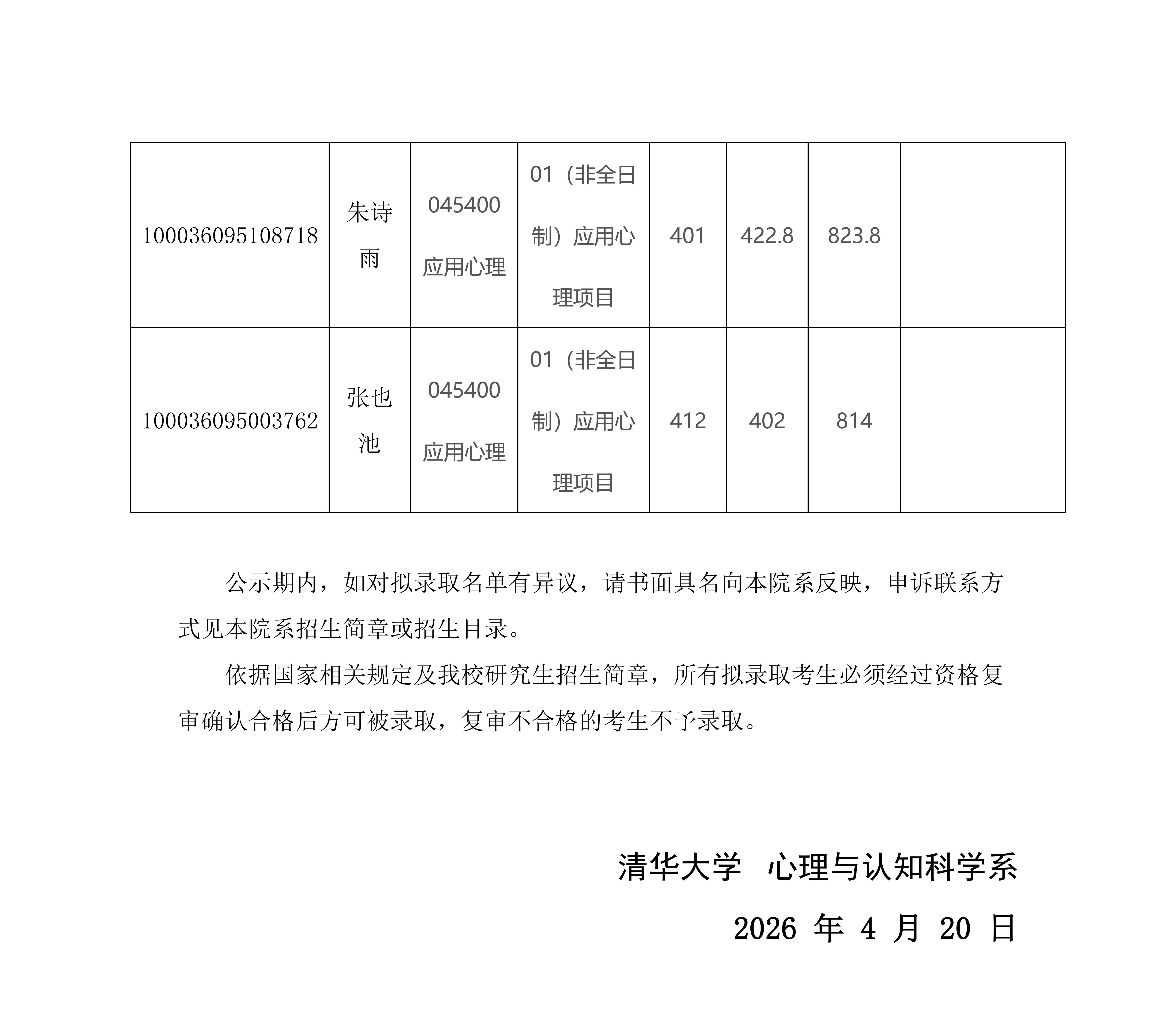 清华大学2026年心理与认知科学系硕士研究生应用心理项目拟录取名单公示
